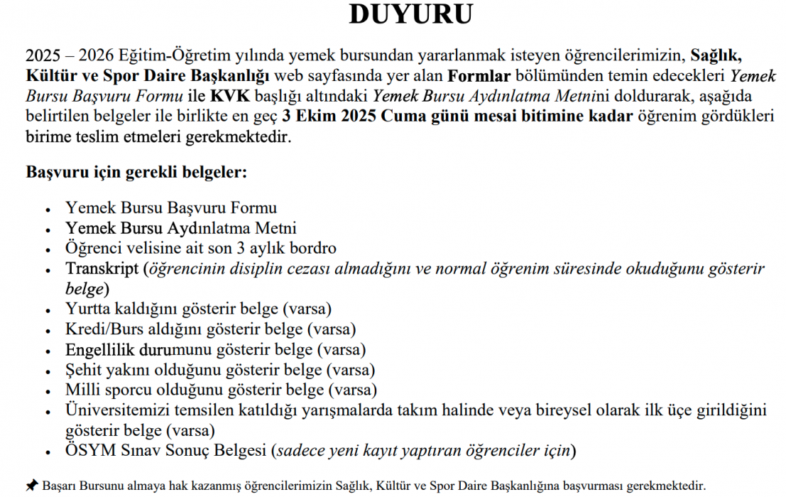 Yemek Bursu Başvuru Duyurusu